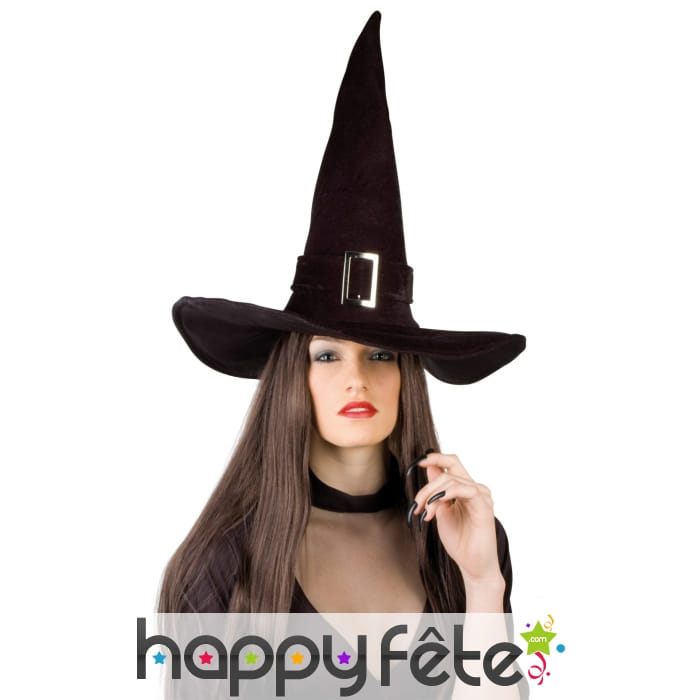 Un déguisement de sorcière va de pair avec un chapeau à longue calotte. Aussi, mesdames, si vous avez opté pour ce genre de costume, nous avons l'accessoire qu'il vous faut. En effet, nous vous proposons ce grand chapeau pointu noir de sorcière avec boucle. Il s'agit d'un couvre-chef haut et large, bordé à sa base par une boucle de ceinture de couleur métal. Ce chapeau de couleur noir possède une longue calotte droite et pointue.