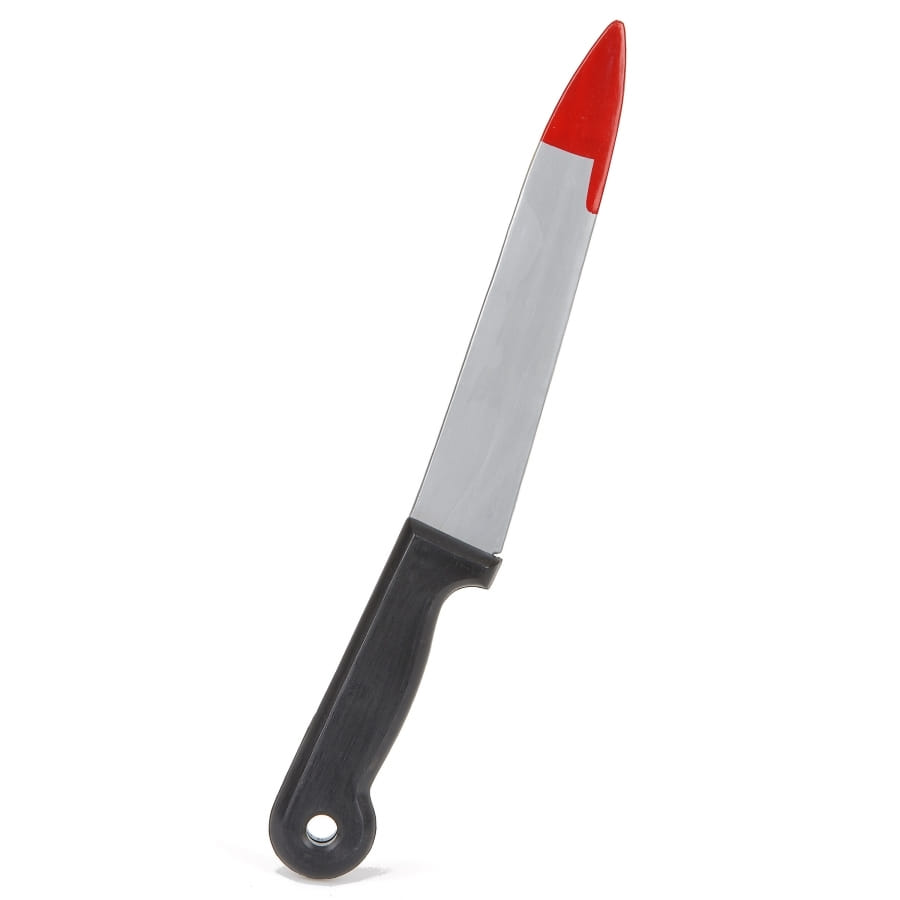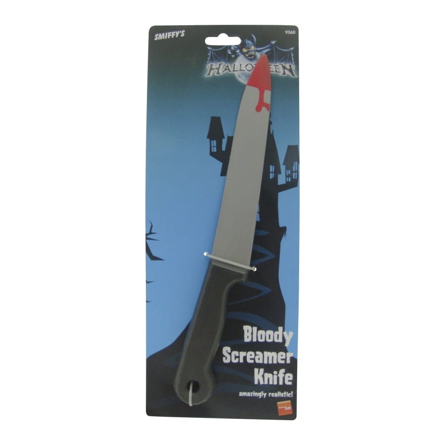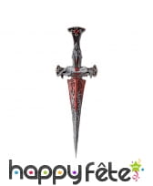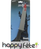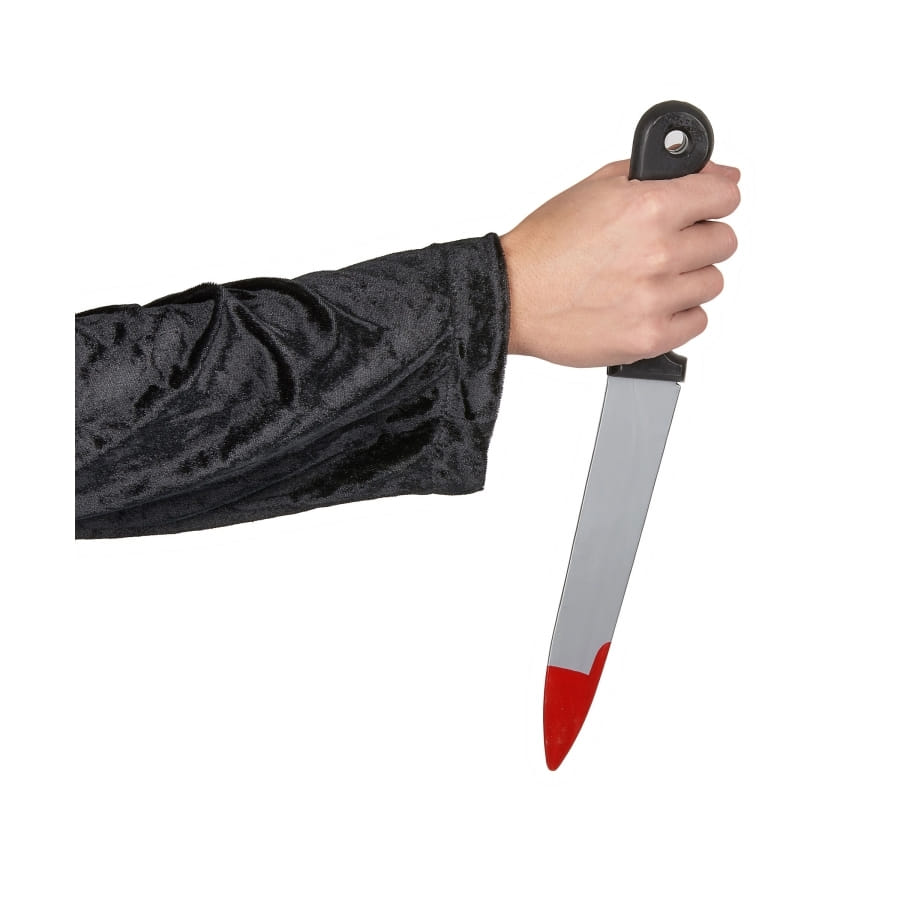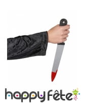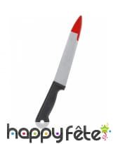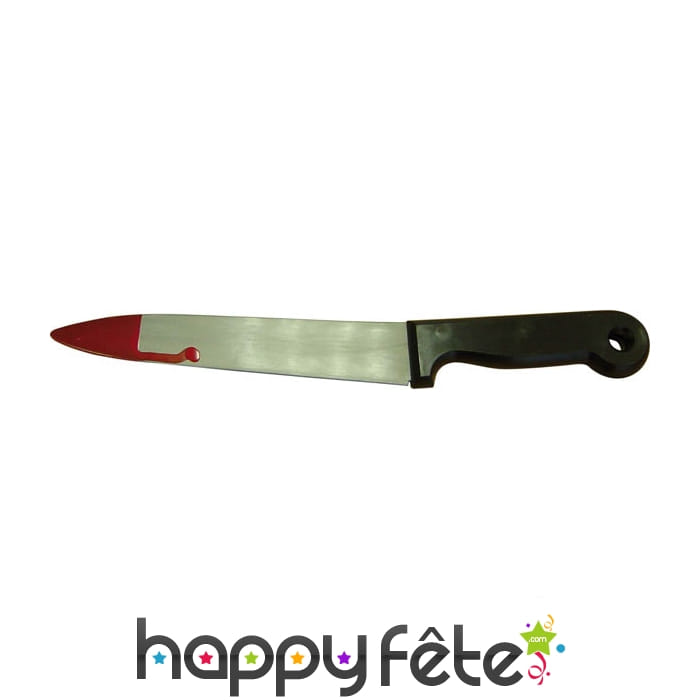 Grand couteau ensanglanté de couleur noire, argentée et rouge, en plastique. Cet accessoire pour homme mesure 35 centimètres de long. Il vous permettra de compléter avec succès un déguisement de tueur, de fou ou autre personnage criminel à l'occasion d'Halloween.