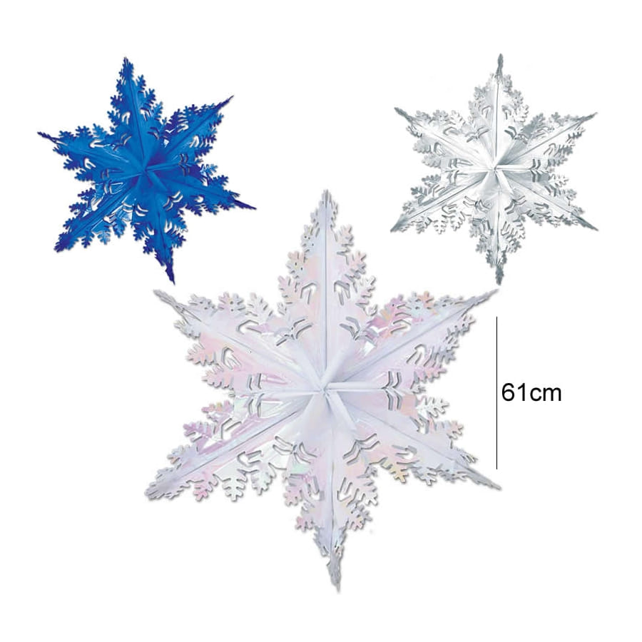 Vivez des moments magiques pendant la période de Noël ! Créez une magnifique décoration avec l'article grand flocon de neige décoratif de 61cm de dimension. Ce modèle vous est proposé sous trois coloris différents : argenté, bleu ou irisé. Inspirez-vous du décor d'un noël hivernal pour créer une ambiance enchantée autour de la cheminée !
