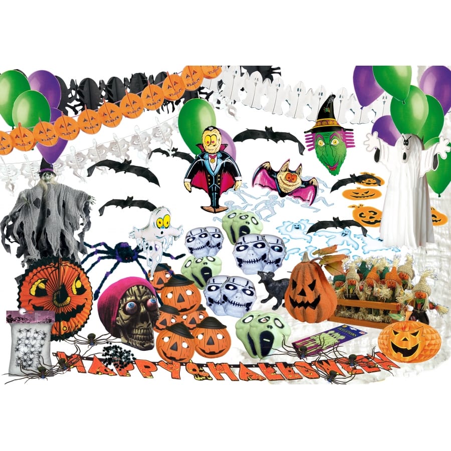 Grand kit de décoration pour Halloween comprenant 100 ballons standards violets, de 100 ballons standards verts, d'un sachet de confettis de table et d'une guirlande citrouille ignifugée. Ce kit est parfait pour décorer une grande salle. Les articles compris peuvent varier dépendant de leur disponibilité.