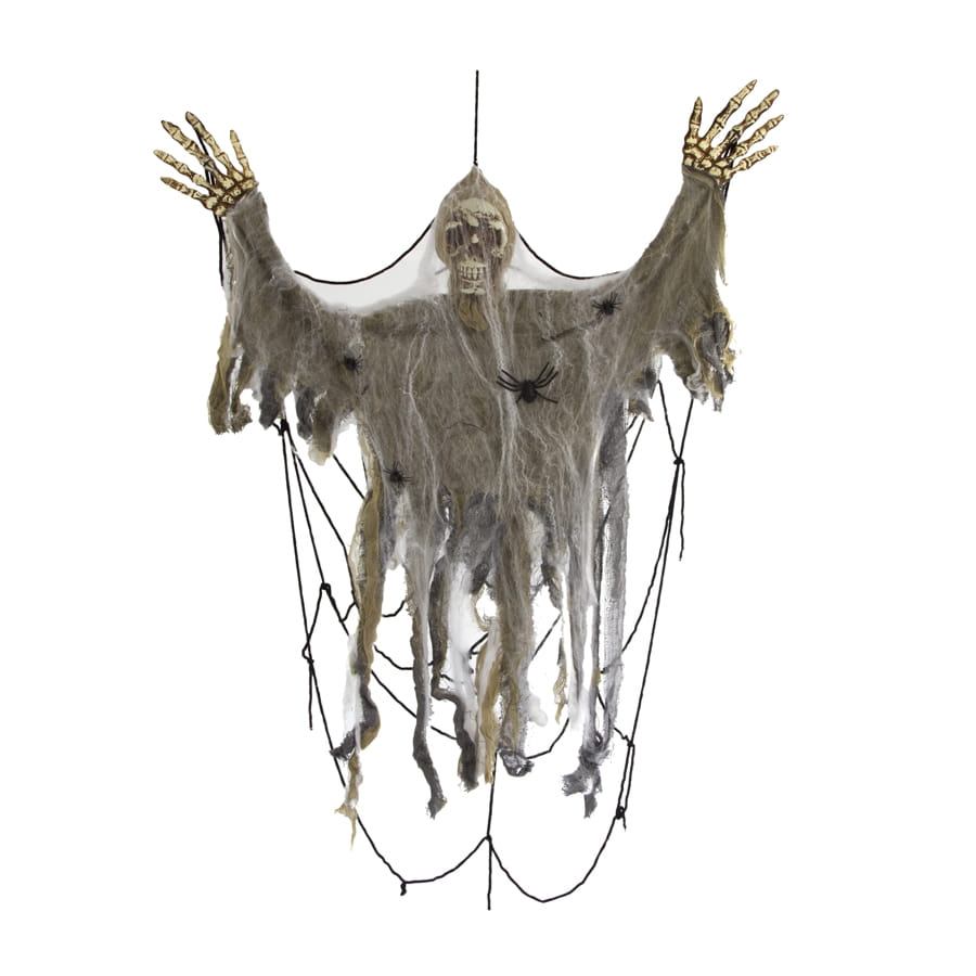 Effet frisson garanti ! Cette décoration si effrayante mesure 1.83 m et représente un fantôme enfermé dans une grande toile d'araignée. Elle est faite en tissu (50%), PVC (10%), plastique (5%) et polyester (35%). Des mygales noires viennent l'agrémenter pour donner un effet plus réaliste. Il suffit de la suspendre dans un coin pour obtenir une décoration Halloween parfaite et macabre.