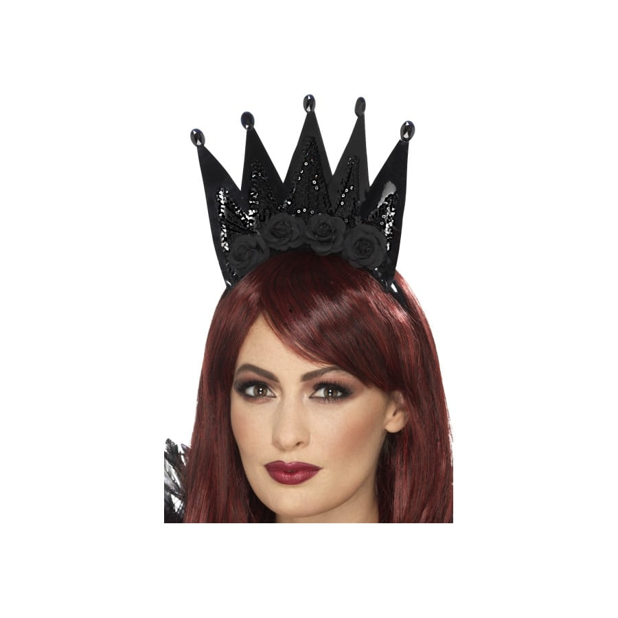 Coiffez votre tête avec la grande couronne noire de reine maléfique à l'occasion d'halloween.