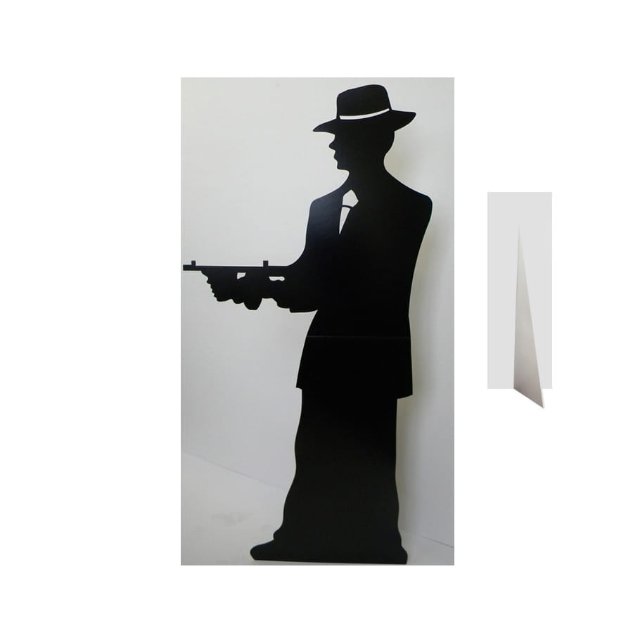 Très kitch cette grande silhouette de gangster armé en carton ! Vous pourrez très bien l'utiliser en guise de décoration pour une soirée à thème mafia, gangster, James Bond etc. Elle est de couleur noire et blanche, montrant juste la silhouette d'un gangster pointant son arme. Sa hauteur est de 185 cm.