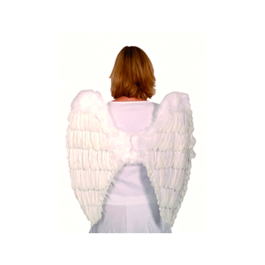 Grandes ailes d'ange complètement recouvertes de plumes blanches. Accessoire pour femme. Les ailes mesurent 65 centimètres de hauteur sur 65 centimètres d'envergure. C'est un accessoire idéal pour se rendre à un carnaval.