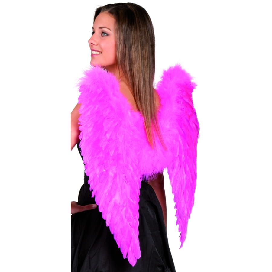 Paire de grandes ailes d'ange fuschias en plumes pour femme. La taille des ailes est de 65 centimètres de hauteur sur 65 centimètres d'envergure. Cet accessoire de déguisement est idéal pour les fêtes de fin d'année ou les carnavals ou encore pour la Noël.