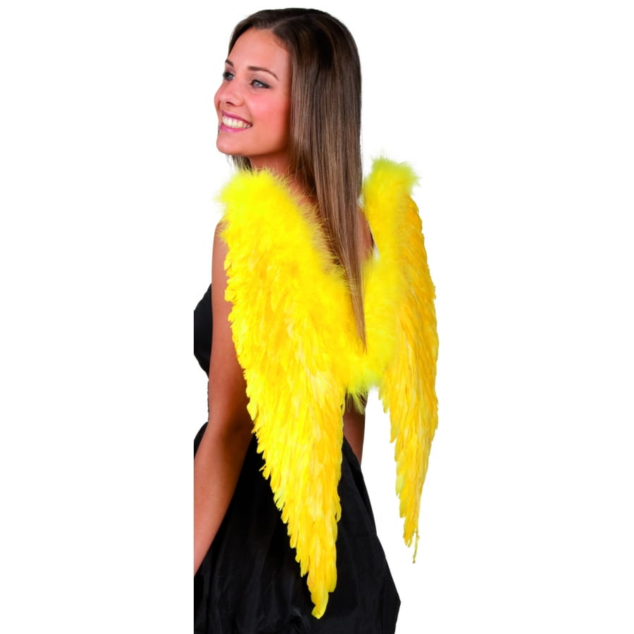 Paire de grandes ailes d'ange en plumes jaunes pour femme. La taille des ailes est de 65 centimètres de hauteur sur 65 centimètres d'envergure. Ce déguisement est idéal pour incarner un ange lors d'une fête de fin d'année ou d'un carnaval.