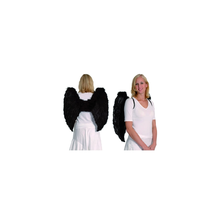 Paire de grandes ailes noires d'ange entièrement recouverte de plumes. La taille des ailes est de 65 centimètres de hauteur sur 65 centimètres d'envergure. Déguisement idéal pour se rendre à une soirée d'Halloween ou à un carnaval pour incarner, par exemple, un ange déchu.