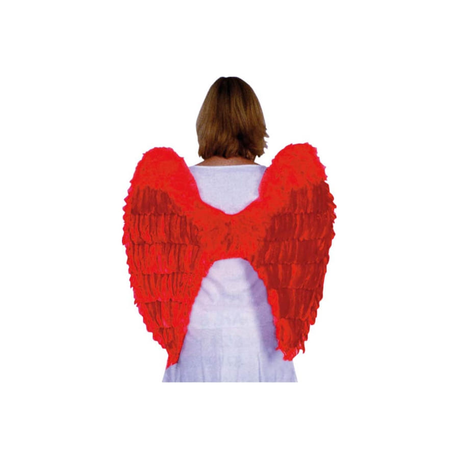 Paire de grandes ailes rouges d'ange avec plumes. Accessoire de déguisement idéal pour une femme. La taille des ailes est de 65 centimètres de hauteur sur 65 centimètres d'envergure. Idéal pour un déguisement d'ange original, un spectacle, etc.