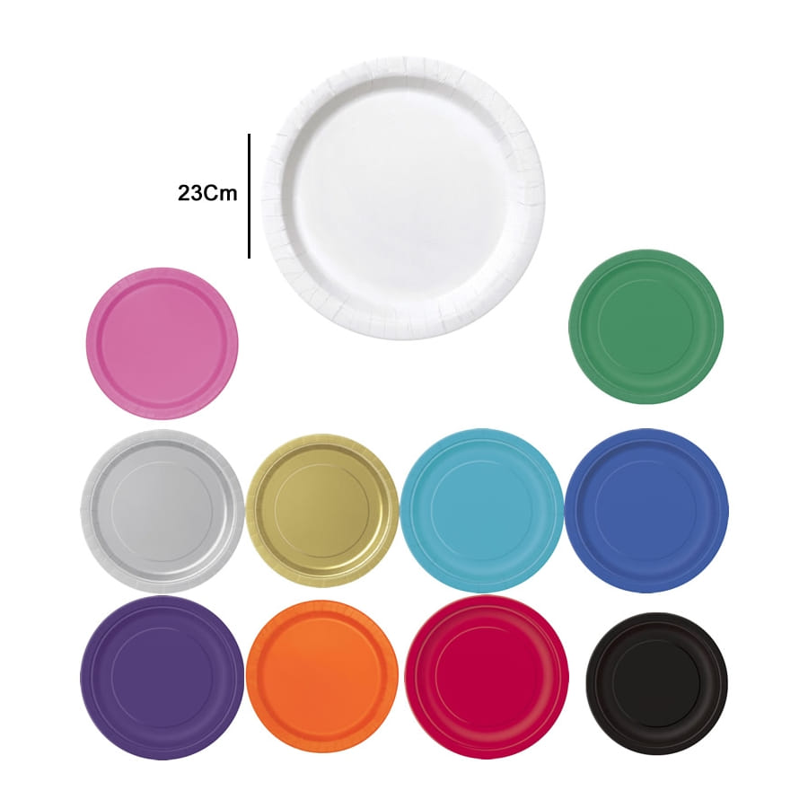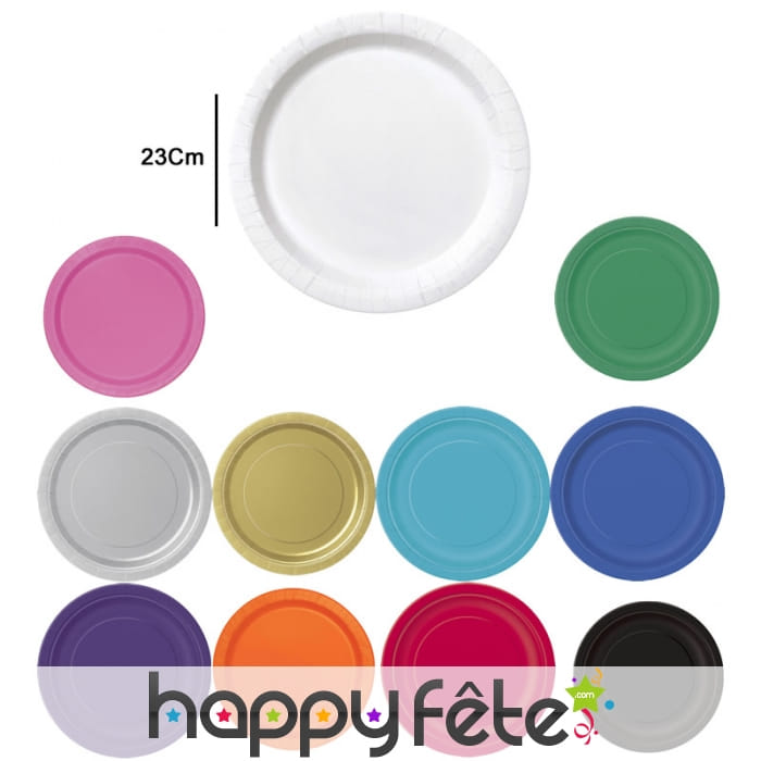 Le soleil est radieux, la journée magnifique, et vous organisez un déjeuner d'anniversaire sur votre terrasse. Soyez simple et efficace au niveau des ustensiles à utiliser. Ce lot de 16 grandes assiettes rondes en carton de 22cm est l'idéal, surtout si vous voulez rassasier vos convives. Chaque plat fait 22,5 cm de diamètre. Un large assortiment de coloris est proposé : bleu, bleu caraïbe, vert émeraude, violet, or et bronze, argenté, blanc, noir, rose, orange et rouge.