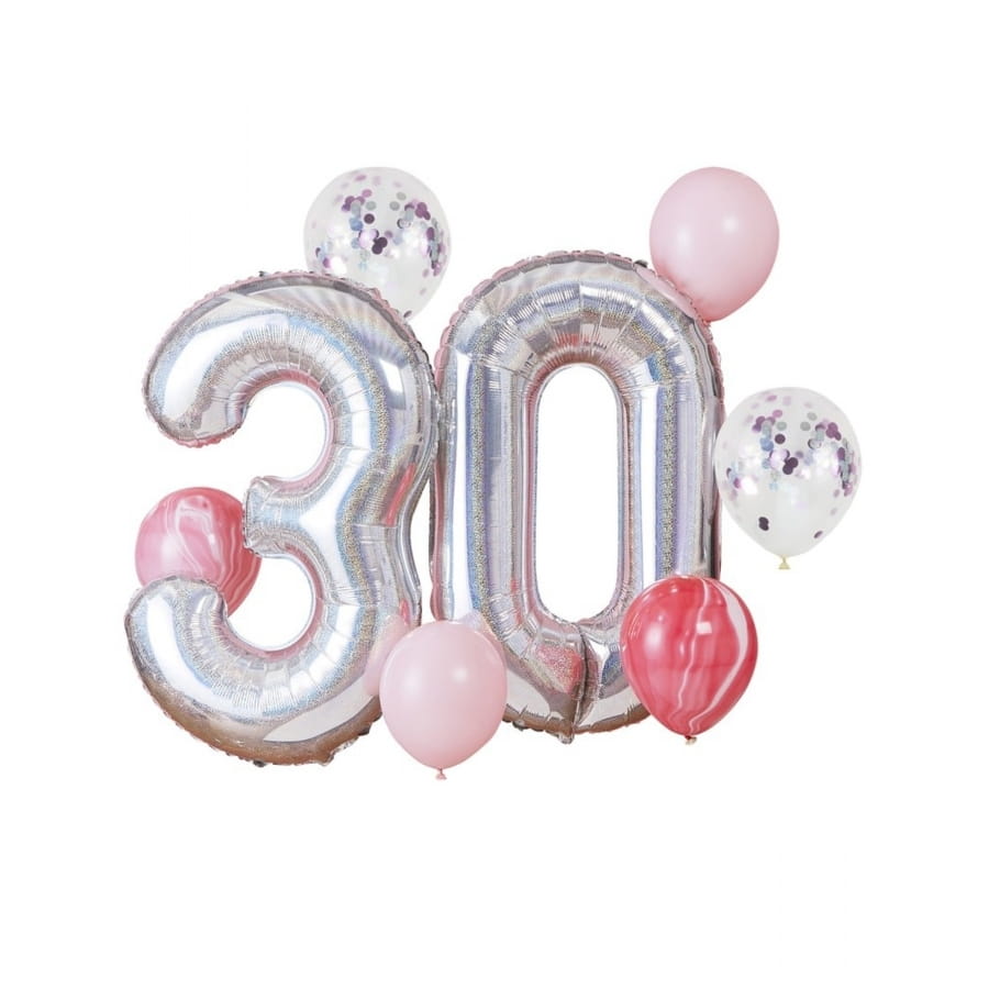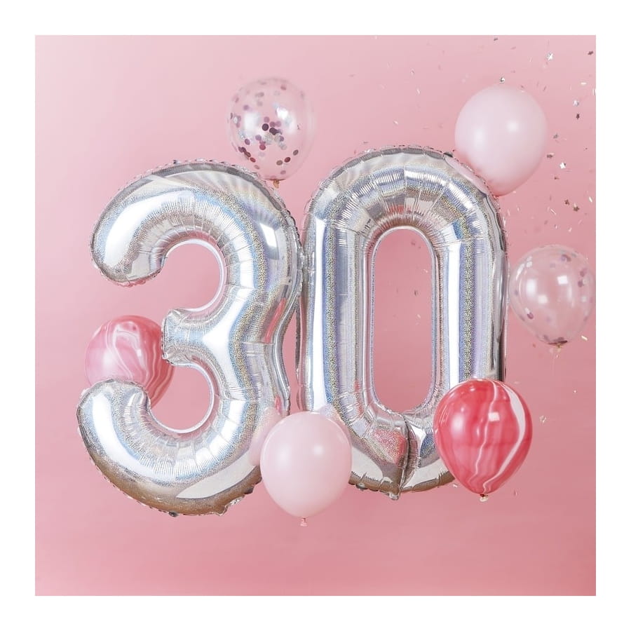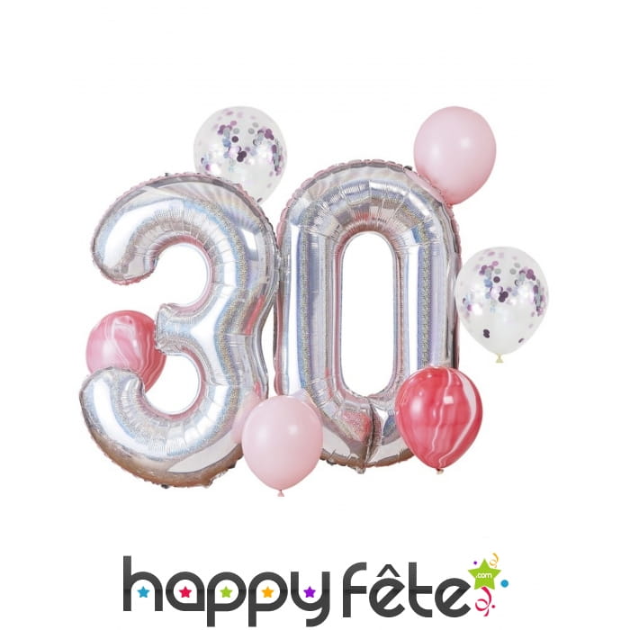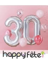 Voyez les choses en grand pour votre anniversaire de mariage, en optant pour les grands ballons 30 ans avec petits ballons rose.