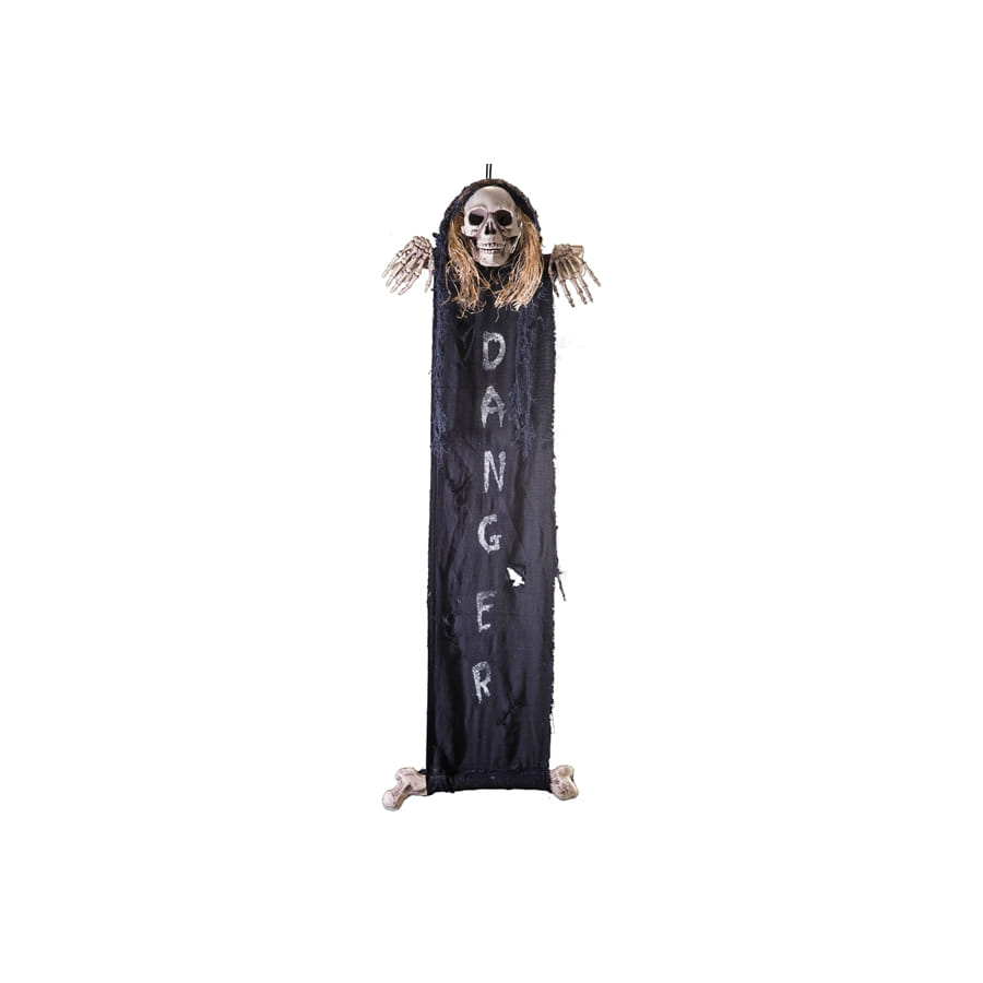 Placez cette superbe bannière à un endroit clé afin de donner une sensation de frayeur à vos invités. Cet accessoire est constitué d'une longue bannière de couleur noire, de 130 centimètres de haut, avec une tête et des mains de mort sur le haut et un os sur le bas. L'inscription "Danger" est écrite dessus en blanc.