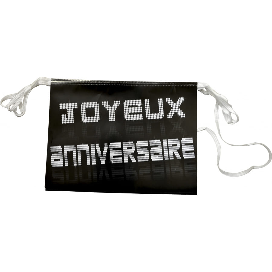Pour la fete d'anniversaire misez sur la décoration. De couleur argent et noir cette guirlande joyeux anniversaire vip fait quatre mètres de long. Elle est noire avec écrit dessus en blanc joyeux anniversaire sur 8 pavillons. Les pavillons en papier font 28* 20 cm.
