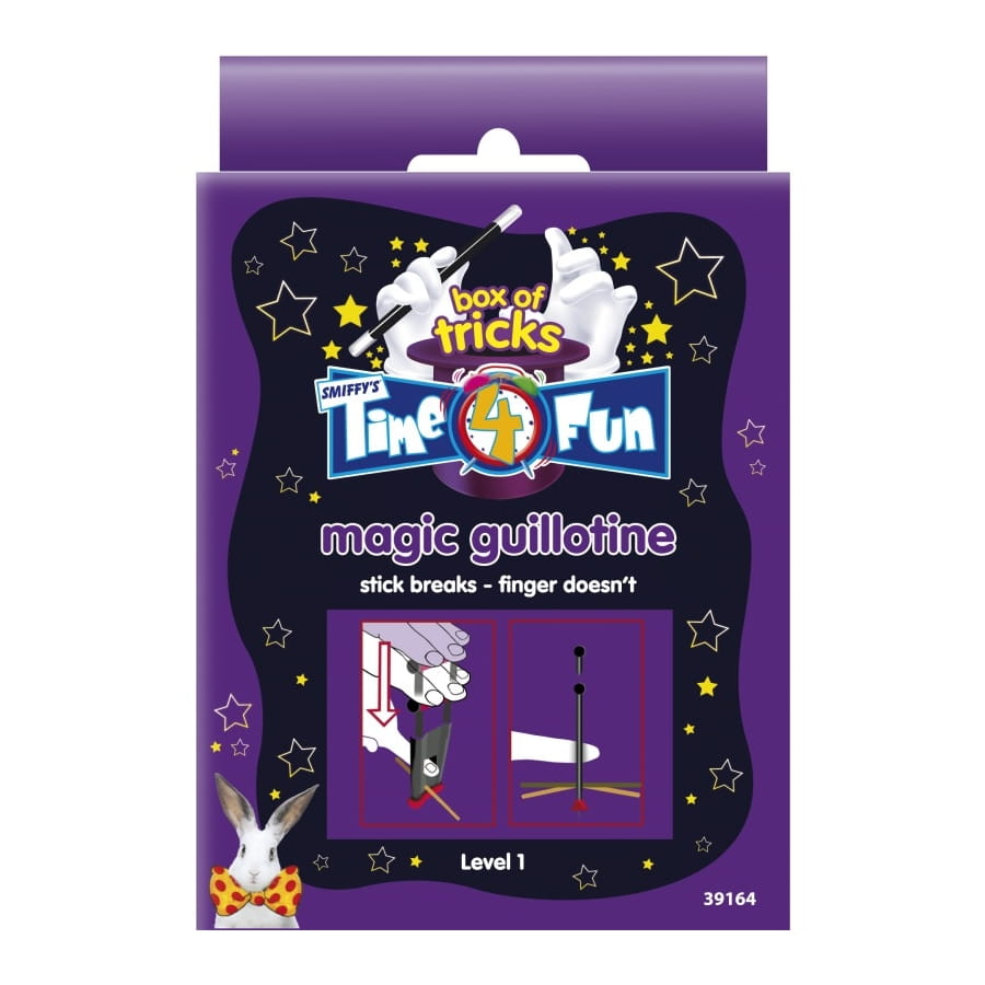 Boîte contenant des accessoires pour un tour de magie de niveau 1 incluant une guillotine magique. Vous pourrez impressionner vos amis ou proches avec ce tour. Placez votre doigt dans la guillotine, mais c'est elle qui se cassera et non votre doigt.