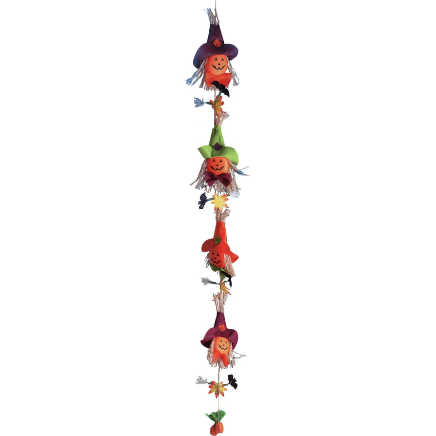 Guirlande entièrement composé d'épouvantails multicolores avec tête en forme de citrouille. Cet accessoire de décoration mesure 150 centimètres de long. Accrochez-la chez vous pour Halloween.