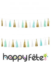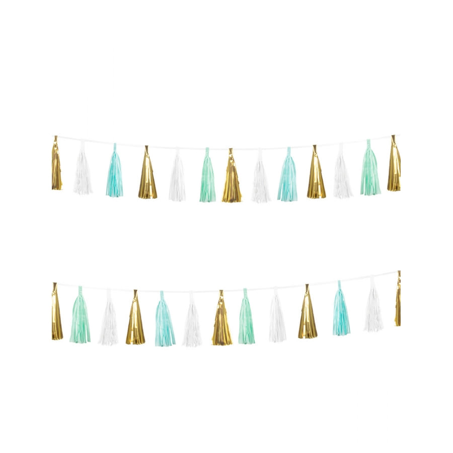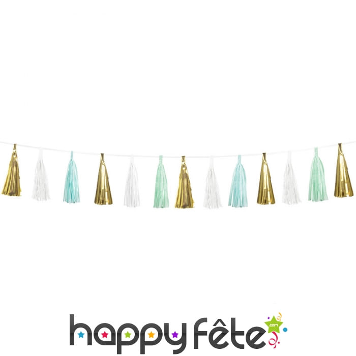La guirlande est décorée de 18 tassels qui possèdent 4 couleurs: dorée, vert eau, blanche, et bleu ciel.