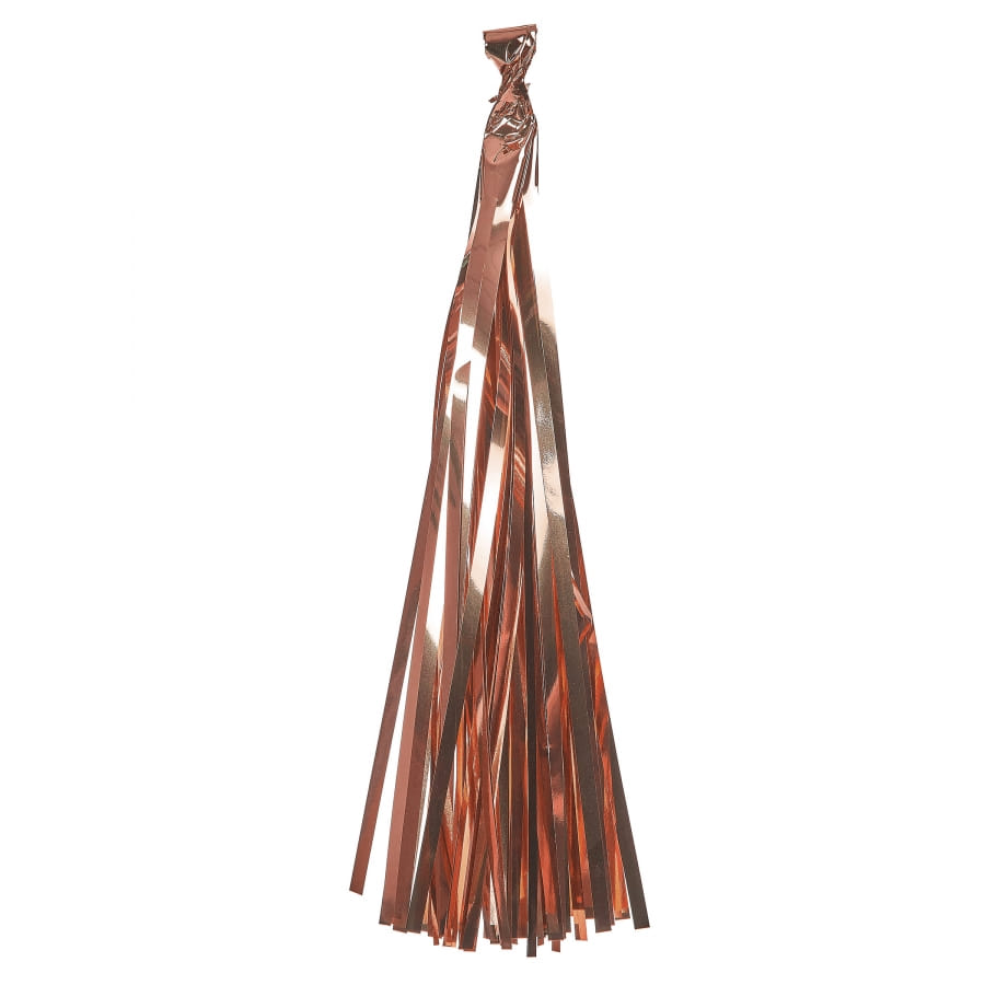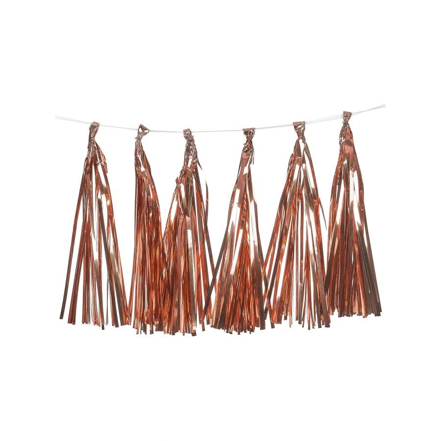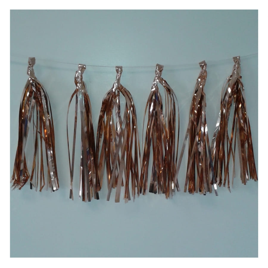 La guirlande à tassels roses effet métallisé est longue de 250 cm.