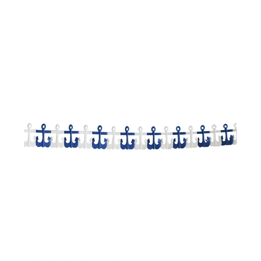 Quand la guirlande est dépliée, elle affiche les motifs d'ancres marines coloris blanc et bleu.
