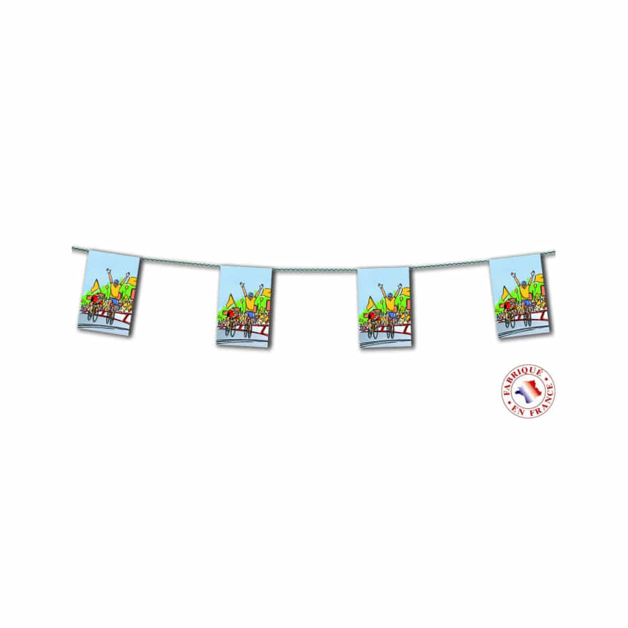 Cette guirlande est composée de 8 fanions rectangulaires, chacun mesurant environ 20 x 30 cm. Chaque fanion est illustré avec des cyclistes en plein sprint vers la ligne d'arrivée, capturant toute l'excitation et l'énergie du Tour de France. Avec ses couleurs vives et son design dynamique, elle apporte une véritable ambiance de compétition à votre décoration.