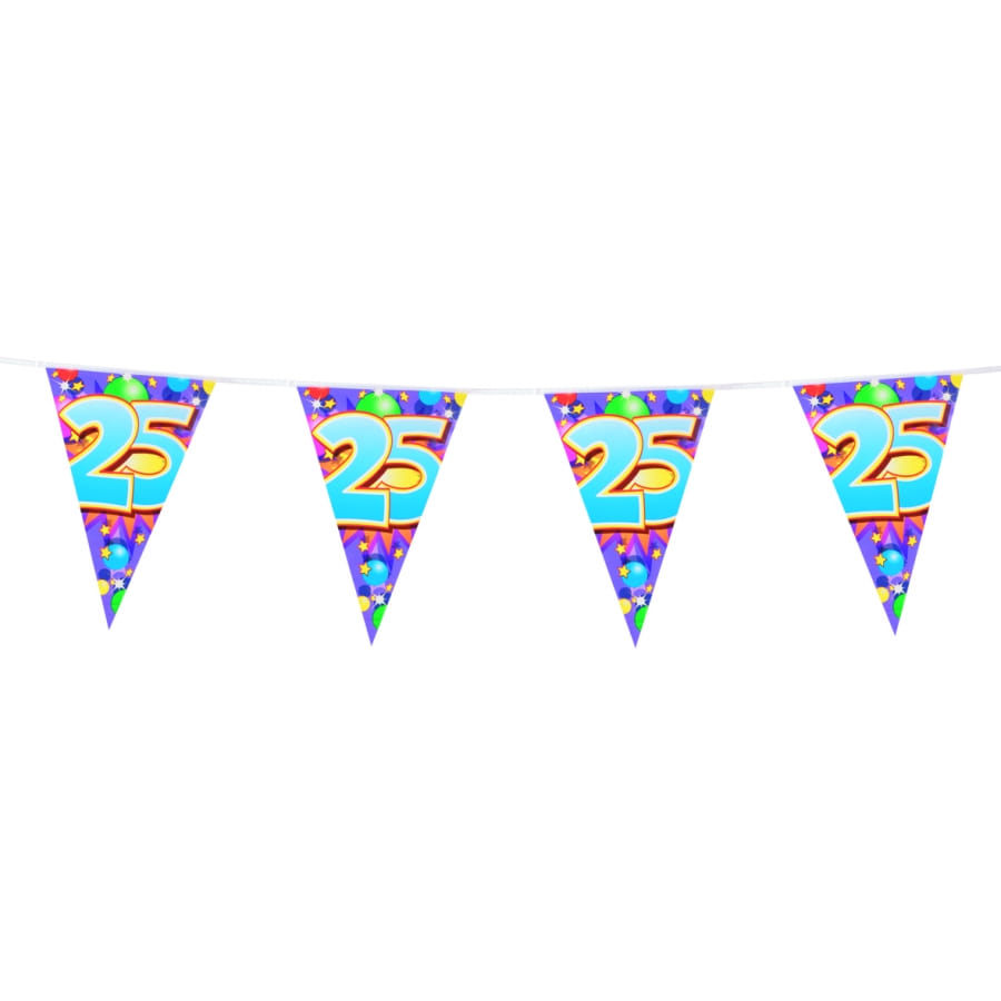 Guirlande d'anniversaire en plastique multicolore agrémentée de petits pavillons triangulaires. Chacun de ces pavillons mesure 20 centimètres sur 30 centimètres et sont imprimés du chiffre 25. La guirlande elle-même mesure 6 mètres de longueur. Créez une ambiance festive pour l'anniversaire de vos amis!