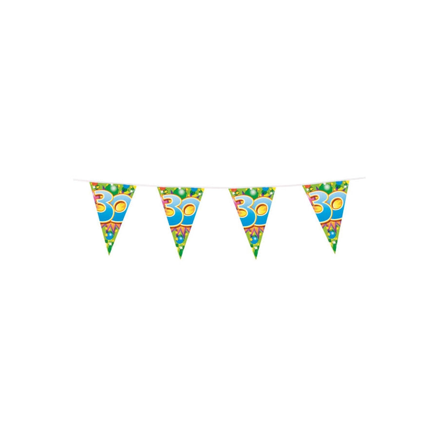 Guirlande d'anniversaire en plastique multicolore agrémentée de petits pavillons triangulaires. Chacun de ces pavillons mesure 20 centimètres sur 30 centimètres et sont imprimés du chiffre 30. La guirlande elle-même mesure 6 mètres de longueur. Cet accessoire est parfait pour une décoration d'anniversaire.