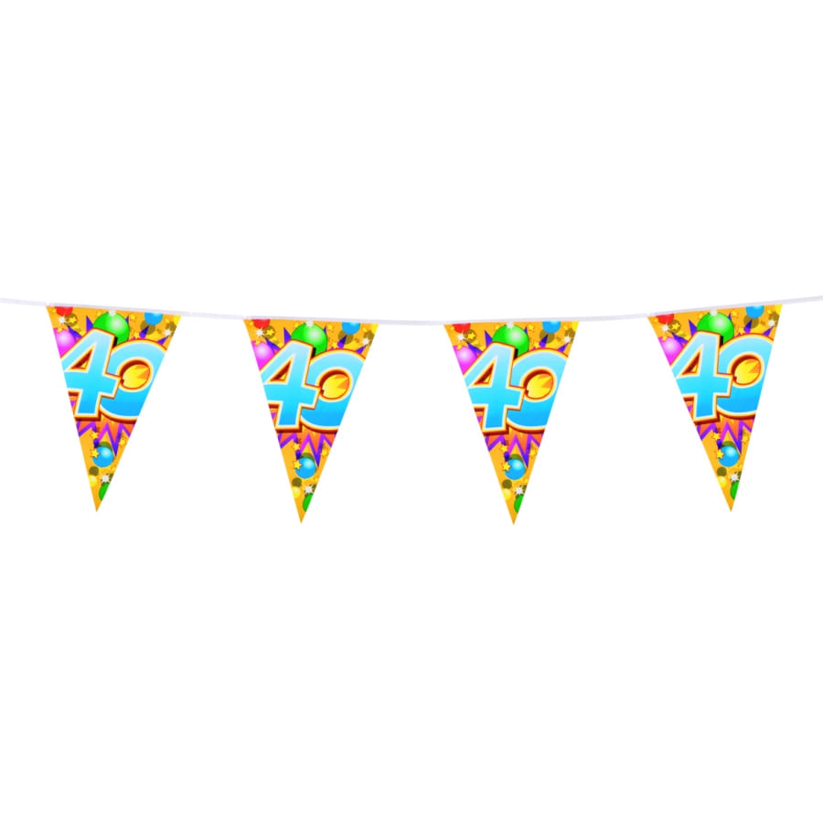 Guirlande d'anniversaire en plastique multicolore agrémentée de petits pavillons triangulaires. Chacun de ces pavillons mesure 20 centimètres sur 30 centimètres et sont imprimés du chiffre 40. La guirlande elle-même mesure 6 mètres de longueur. Cette guirlande est idéale pour l'anniversaire de vos parents ou de vos amis!