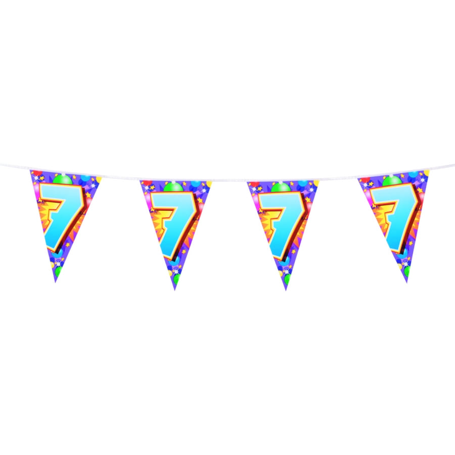 Guirlande d'anniversaire entièrement en plastique multicolore agrémentée de pavillons triangulaires. La guirlande mesure 6 mètres de long. Chaque pavillons est imprimé du chiffre 7 et mesure 20 centimètres sur 30 centimètres. Cette guirlande est parfaite pour un anniversaire d'enfant.