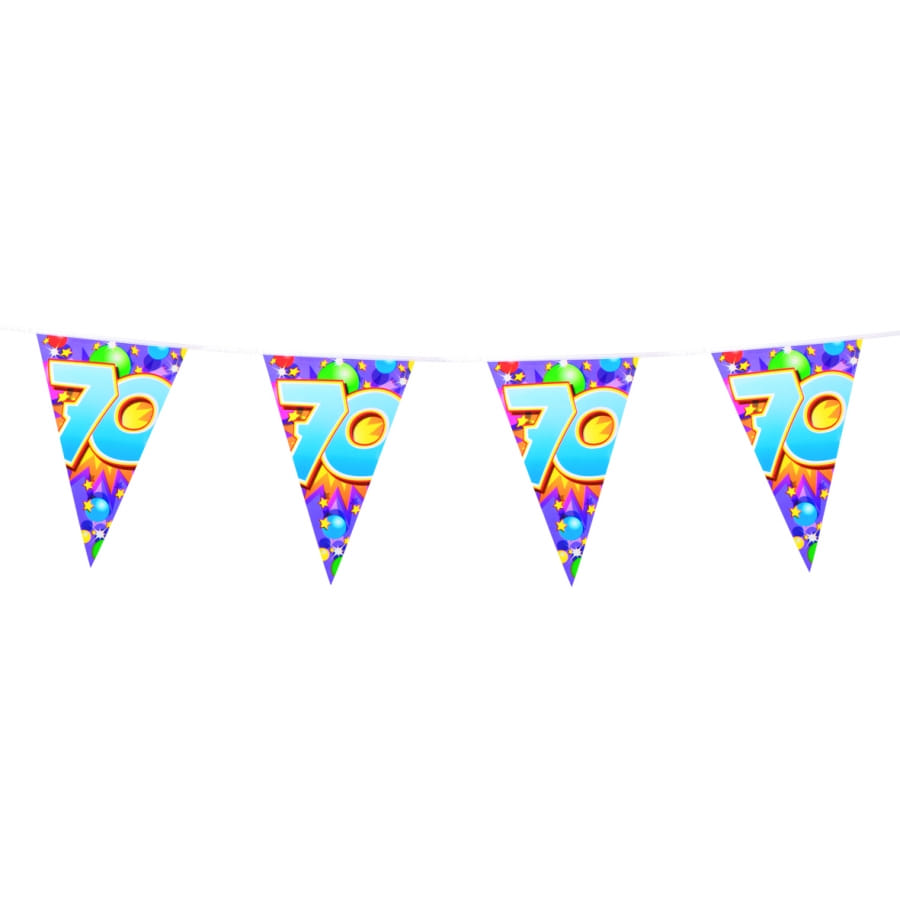 Guirlande d'anniversaire en plastique multicolore agrémentée de petits pavillons triangulaires. Chacun de ces pavillons mesure 20 centimètres sur 30 centimètres et sont imprimés du chiffre 70. La guirlande elle-même mesure 6 mètres de longueur. Cet accessoire est parfait pour égayer l'anniversaire de vos parents ou de vos grands-parents.