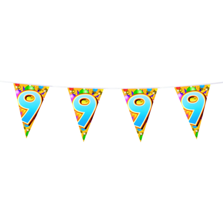Guirlande d'anniversaire entièrement en plastique multicolore agrémentée de pavillons triangulaires. La guirlande mesure 6 mètres de long. Chaque pavillon est imprimé du chiffre 9 et mesure 20 centimètres sur 30 centimètres. C'est un accessoire parfait pour créer une ambiance festive lors d'un anniversaire.