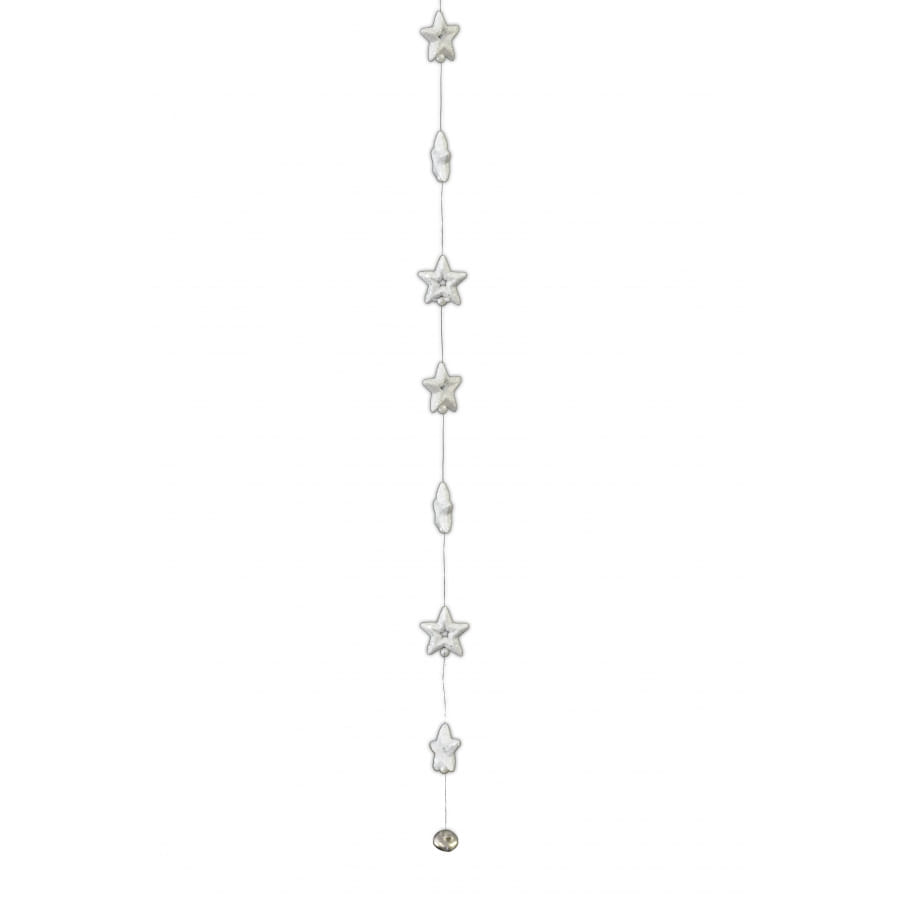 Rien n'est trop beau pour parfaire sa décoration. De ce fait, nous vous proposons cette jolie guirlande qui pourra vous servir autant à Noël pour décorer le sapin, qu'en suspension au plafond ou en chemin de table. La guirlande est faite d'étoiles blanches irisées pailletées, chacune de 5,5 cm avec des perles, et le tout mesurant 1,70 m.