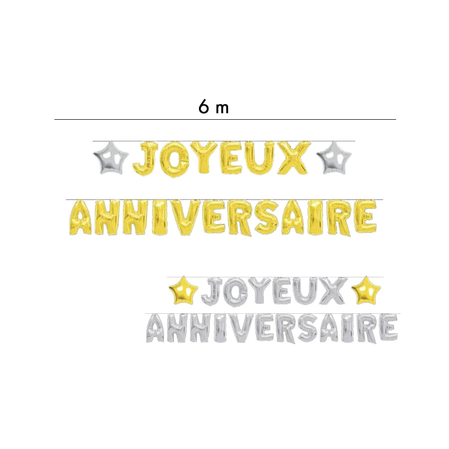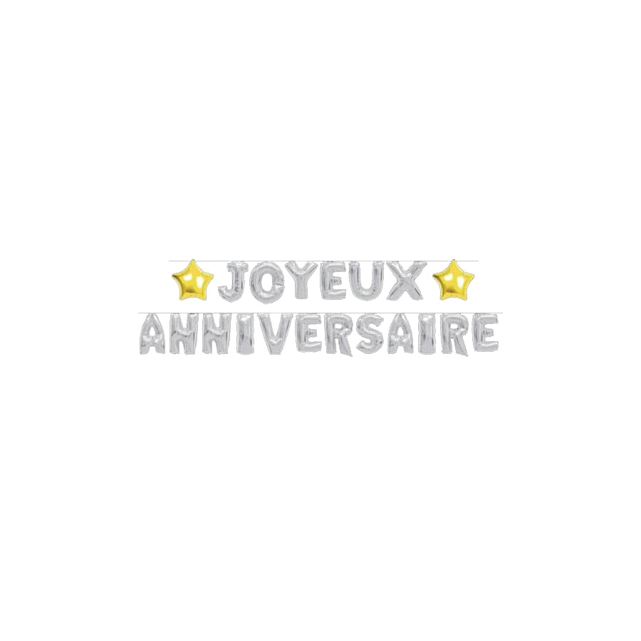 Ils forment l'expression JOYEUX ANNIVERSAIRE agrémentée par deux étoiles dorées si vous faites le choix de l'argent ou argentées si vous avez choisi la couleur or.