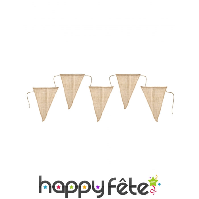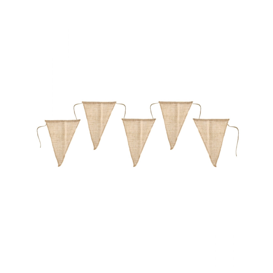 Cette guirlande se compose de fanions de forme triangulaire confectionnés à base de toile de jute.