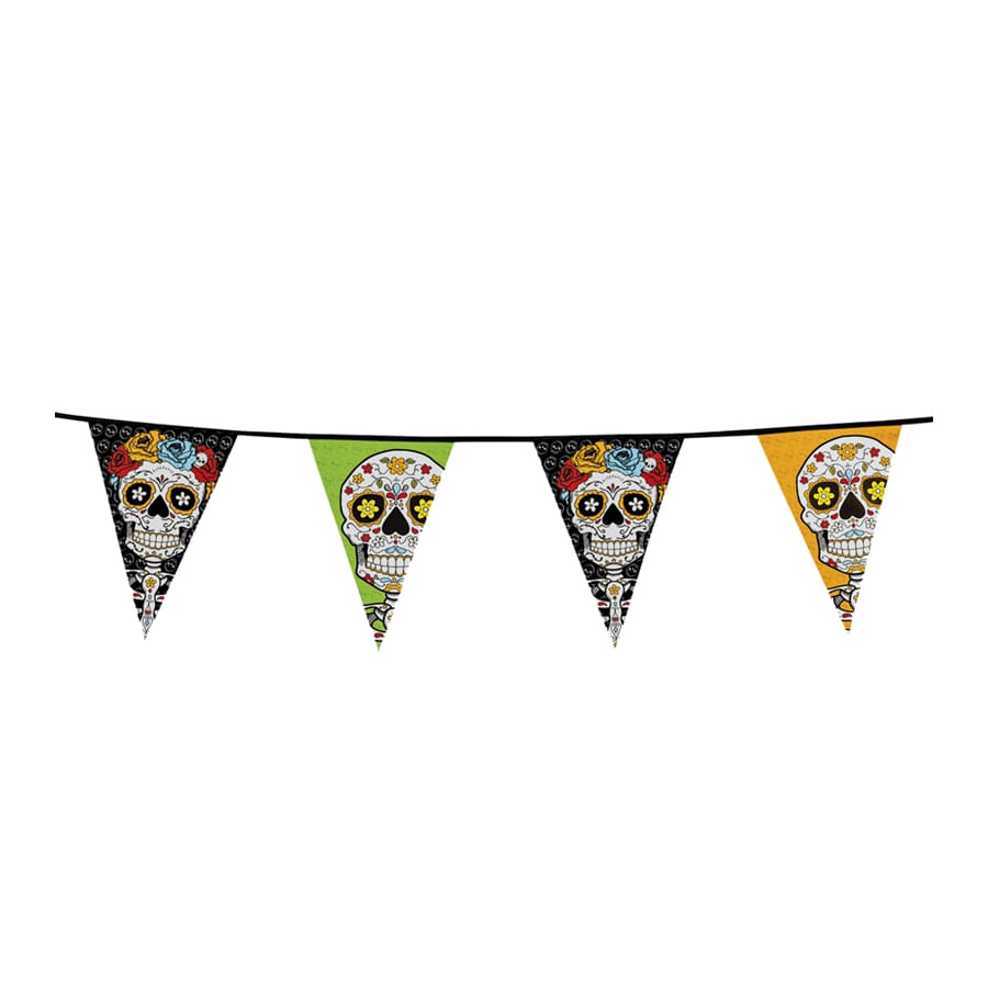 Les maisons se parent de guirlandes à Halloween. En guise de déco, ajoutez de superbes fanions pour rendre unique votre demeure à cette période de l'année. Une décoration qui est imprimée avec des dessins de crâne, conçus dans des tons colorés pour vous taper dans l'oeil. La guirlande est équipée de 20 fanion dont la couleur du fond est unie et flashy et mesure 36x25cm chacune.