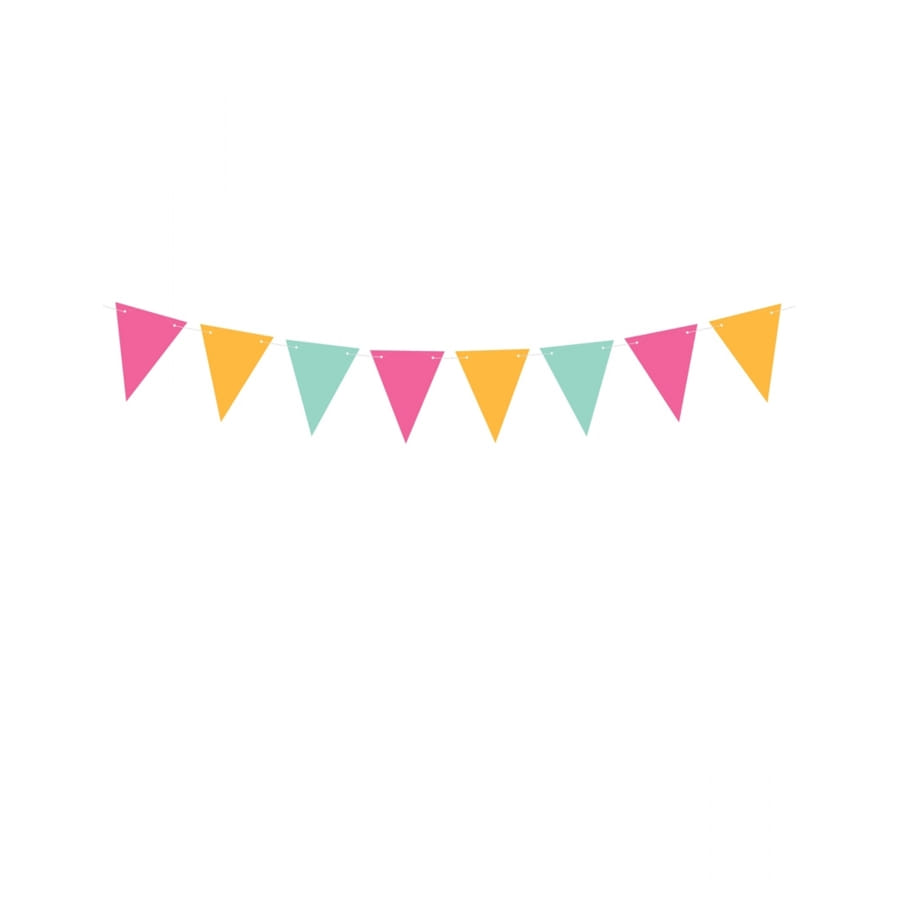 Cet ornement est constitué d'une alternance de petits fanions en carton de couleur rose, orange et vert.