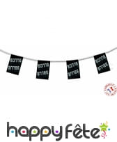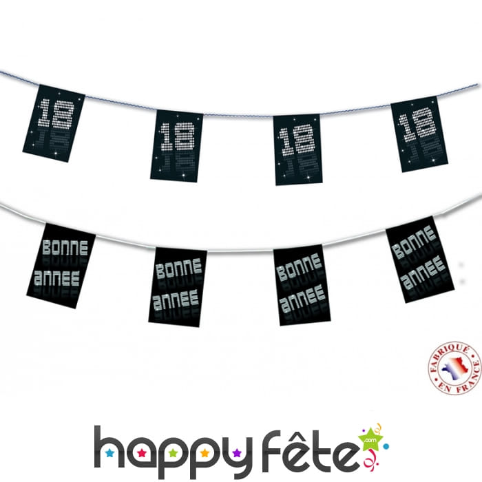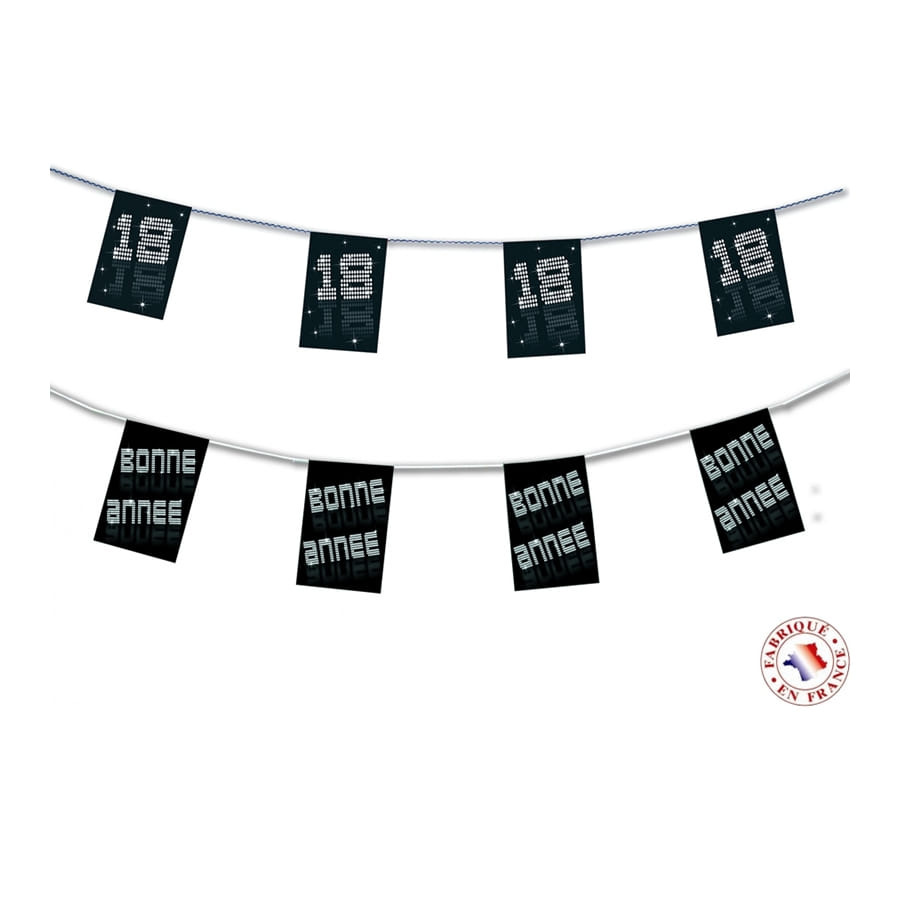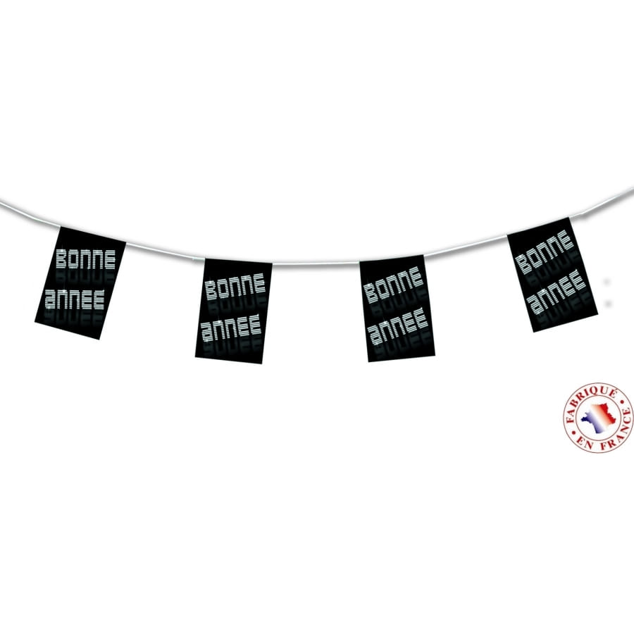 Une guirlande composée de fanions de 30 x 20 cm sur lesquels est marquée sur fond noir l'inscription BONNE ANNÉE écrite dans un style VIP de couleur blanche.