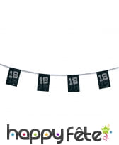 Une guirlande faite de fanions (au nombre de 8) mesurant 20 x 30,5 cm et qui présentent sur fond noir de petits points blancs dont certains brillent plus que d'autres et qui forment le nombre 18.