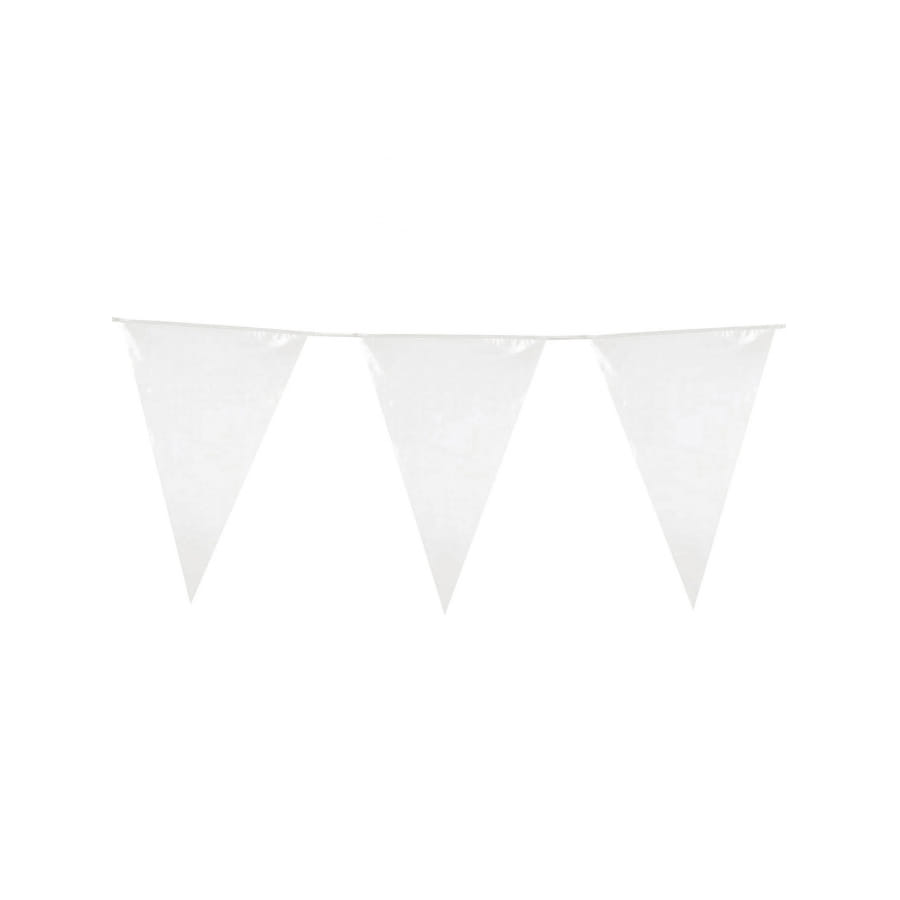 Guirlande en plastique composé de grands pavillons triangulaires. Elle mesure 10 mètres de long et est spécialement conçue pour une décoration extérieure. Elle sera disponible en blanc ou en fuschia au moment de la commande. Cette guirlande est idéale pour plusieurs occasions.