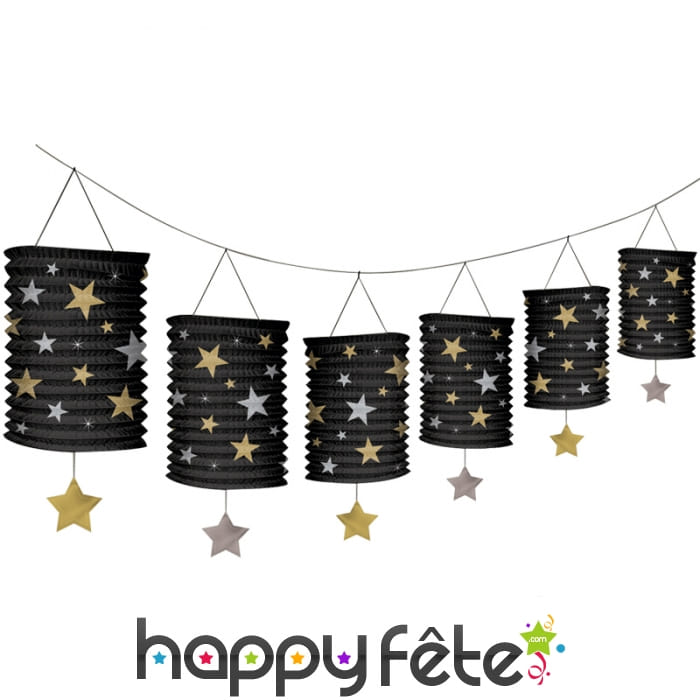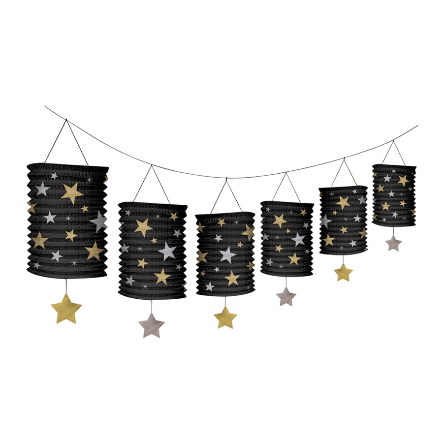 Hollywood est le lieu de référence en matière d'industrie cinématographique. Découvrez une extraordinaire guirlande de lanternes Hollywoodiennes 3,65m de longueur, pour apporter une ambiance de star à vos soirées. Ces lanternes décoratives sont de couleur noire, et recouvertes d'une flopée d'étoiles de couleur argent et or et bronze. Chacune d'elles fait 13 cm de dimension.