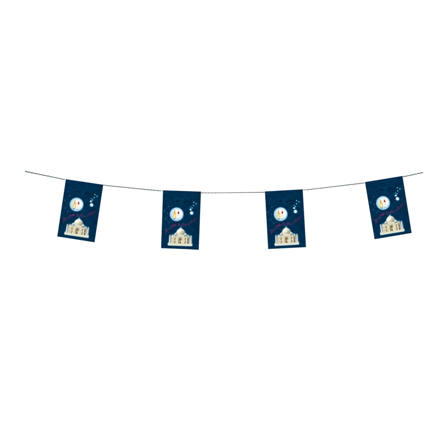 Les contes des Mille et Une Nuits vous emporteront aux fins fonds de l'Orient. La guirlande de pavillons avec motifs 1001 nuits est parfaite pour décorer. Cette guirlande de 4 m de long est formée d'une série de 8 pavillons de couleur bleue. Chacun d'eux fait 20 x 30 cm de dimension et comporte une image inspirée de 1001 nuits.
