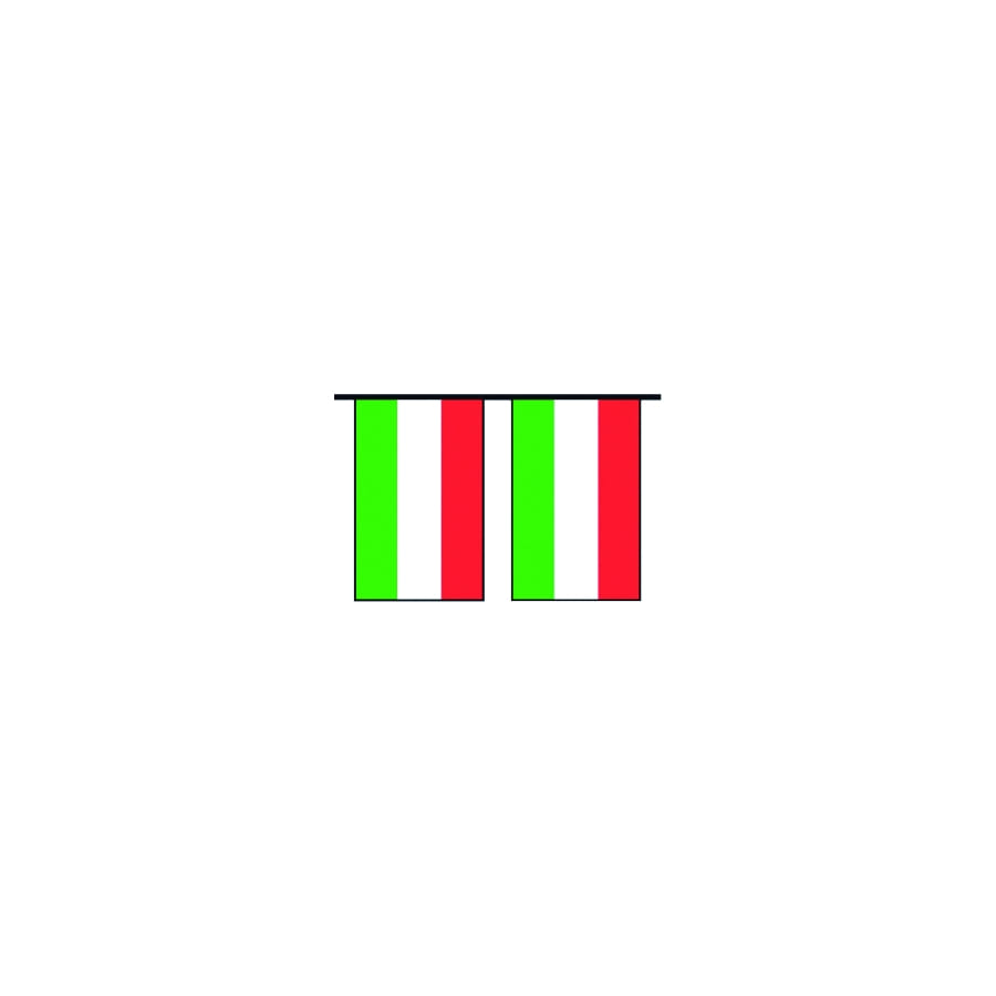 Guirlande en plastique, agrémentée de 20 pavillons rectangulaires blancs, rouges et verts, représentant le drapeau hongrois. Chacun de ces pavillons mesure 20 centimètres de largeur sur 30 centimètres de hauteur. La guirlande elle-même mesure 10 mètres de long. Elle est parfaite pour une décoration spécial Hongrie.