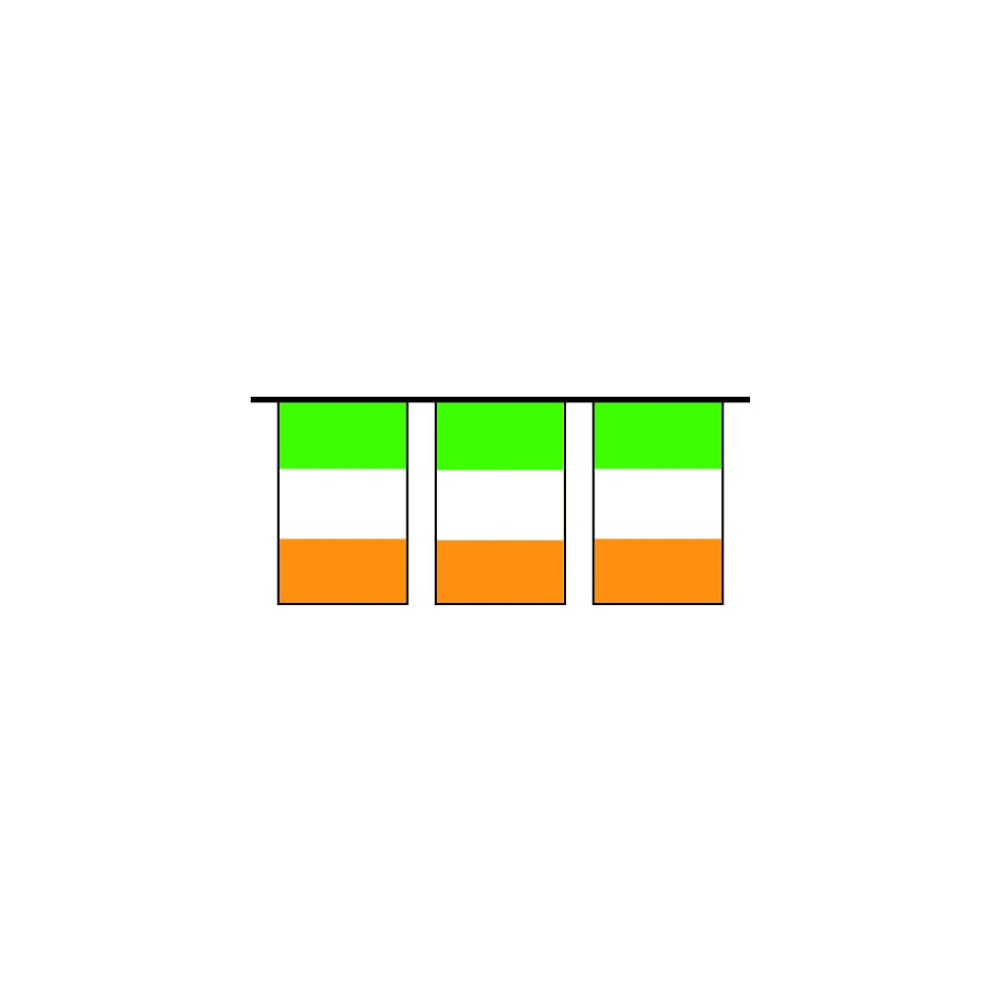 Cette guirlande est parfaite pour une décoration de fête nationale telle que la Saint Patrick. Guirlande en plastique agrémentée de 20 pavillons rectangulaires représentant le drapeau de l'Irlande. Les pavillons sont orange, verts et blancs et mesurent 20 centimètres de largeur sur 30 centimètres de hauteur. La guirlande mesure 10 mètres de long.