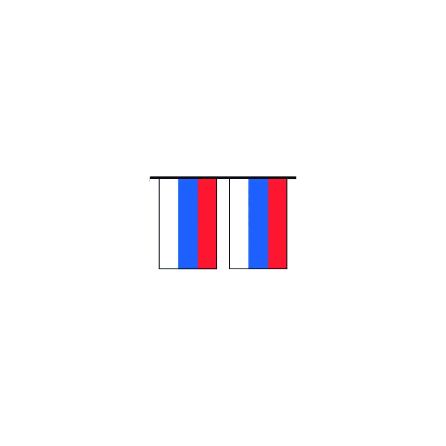 Guirlande en plastique, agrémentée de 20 pavillons rectangulaires blancs, bleus et rouges, représentant le drapeau russe. Chacun de ces pavillons mesure 20 centimètres de largeur sur 30 centimètres de hauteur. La guirlande elle-même mesure 10 mètres de long. Cette guirlande est parfaite pour tous les supporters de la Russie.
