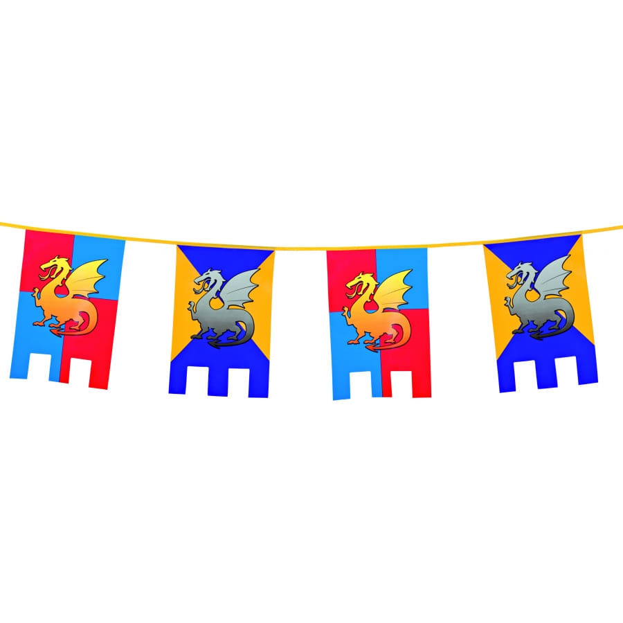 Guirlande en plastique mesurant 6 mètres de long. Cet accessoire est composé de pavillons rectangulaires avec des dessins de dragons de couleur rouge, jaune, bleu et grise. Installez-la chez vous à l'occasion de l'anniversaire de votre garçon pour son plus grand bonheur.