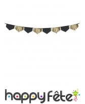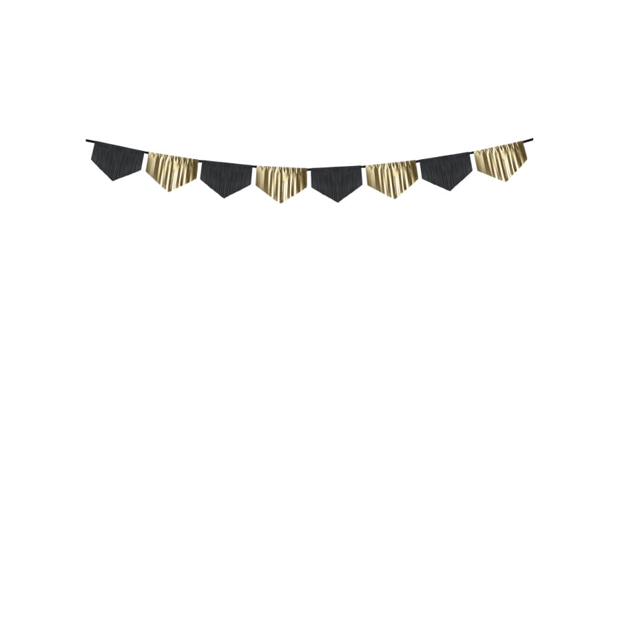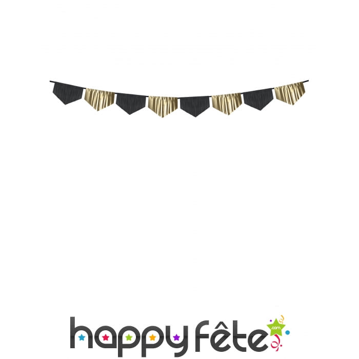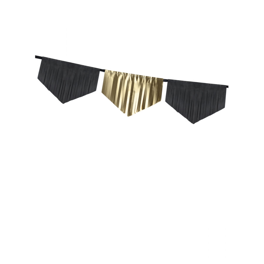 La particularité de cette guirlande, c'est son design unique : des triangles noirs et dorés s'alternent pour un effet des plus chics. Le noir apporte une touche d'élégance et de mystère, tandis que le doré y ajoute une pointe de luxe et de paillettes. Ensemble, ils forment un duo gagnant, prêt à éblouir vos invités !