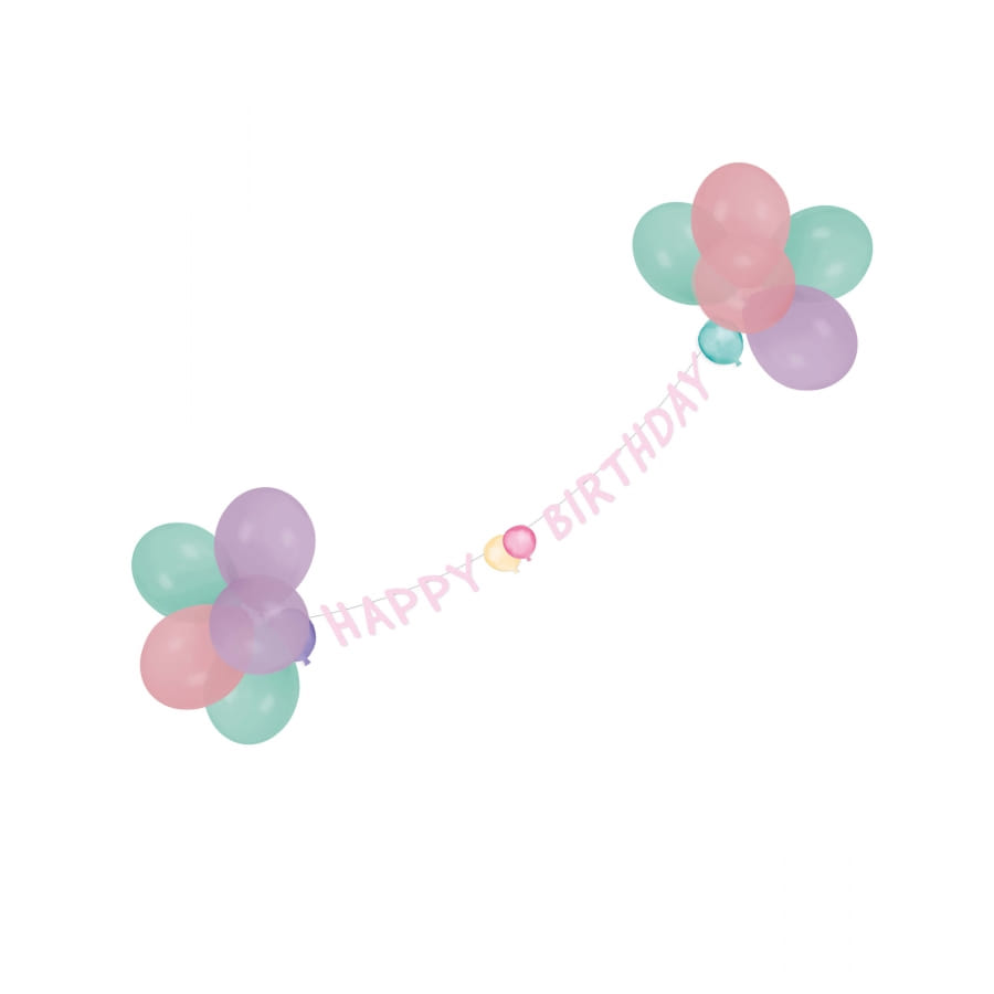 Ils encadrent la mention HAPPY BIRTHDAY en lettres roses, au centre de la guirlande.