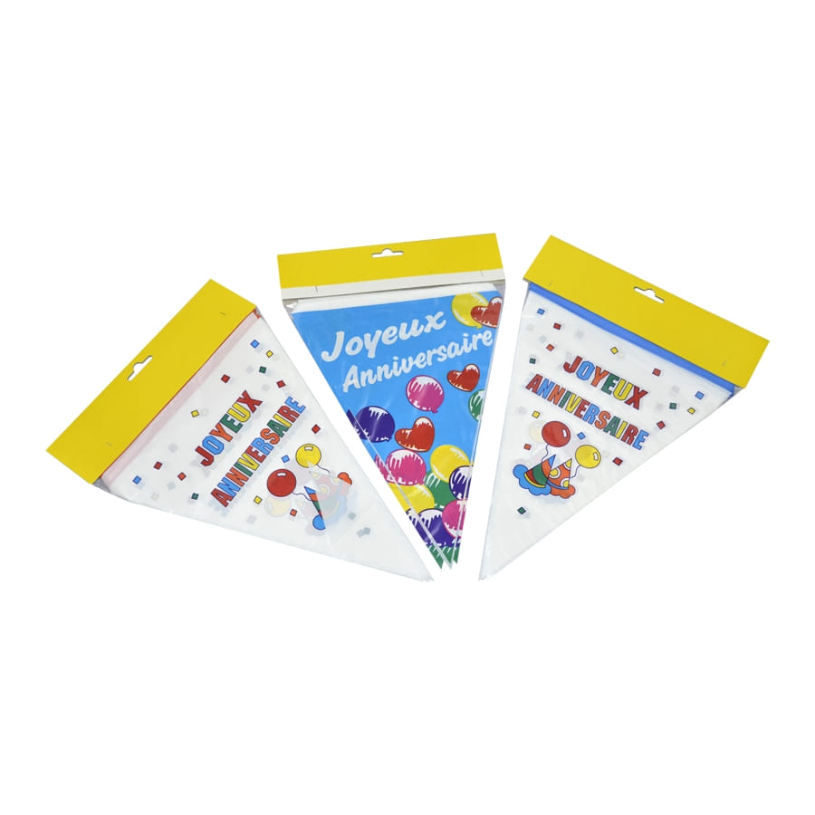 Pour célébrer un grand évènement comme les anniversaires par exemple, il faut de l'imagination pour la décoration. Si vous n'avez pas le temps d'y penser, nous vous conseillons d'accrocher partout cette guirlande composée de pavillons triangulaires avec l'inscription "Joyeux anniversaire" et des petits ornements. Ces guirlandes, à elles seules, constituent une très grande partie de la décoration. Pour le reste, nous comptons sur vous! Vous n’avez qu’à farfouiller dans la section décoration du site, vous trouverez votre bonheur. Lors de votre commande vous recevez l'une des trois guirlandes présentées (selon disponibilité en stock).