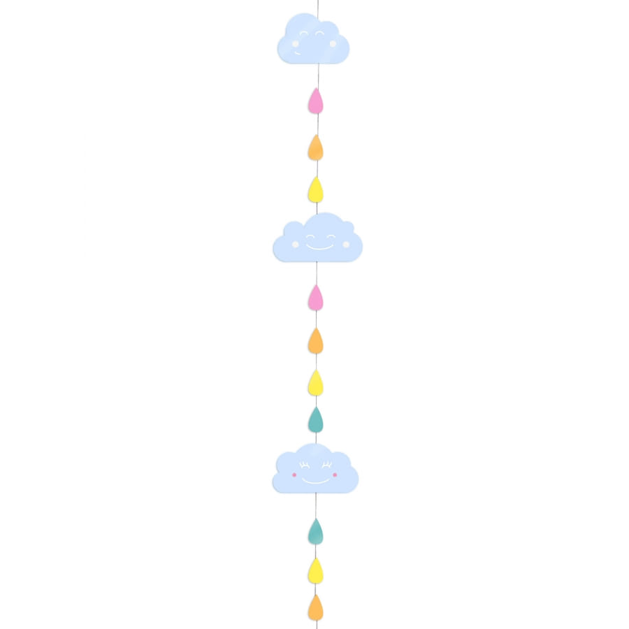 Cette guirlande nuage à suspendre de 160 cm est composée d'un fil blanc sur lequel se trouvent des vignettes faites en carton.