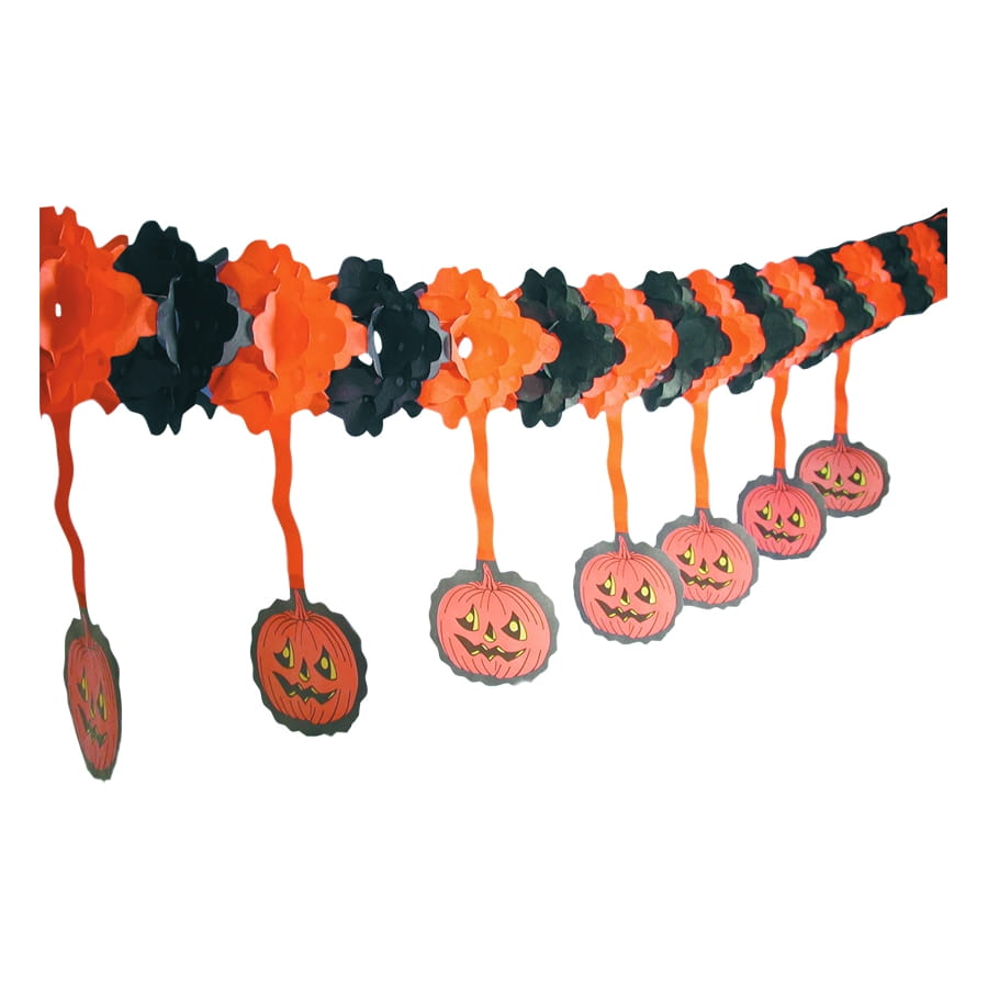 Guirlande de couleur orange et noire, ornée de citrouilles assorties. Cet accessoire mesure 4 mètres de long. Cette guirlande est donc idéale pour Halloween et pour une grande salle de fête.