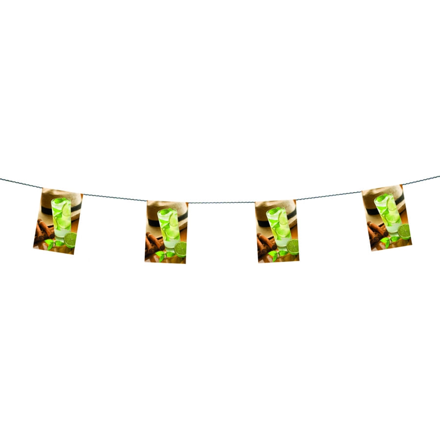 Guirlande en papier ignifugé avec 8 pavillons. Chacun des pavillons est imprimé sur les 2 faces d'un dessin de 'Cocktail de Cuba avec Cigares' et mesure 20 centimètres carrés. La guirlande mesure 4 mètres de long. Ornez votre salle de fête de ces guirlandes pour créér une atmosphère exotique.
