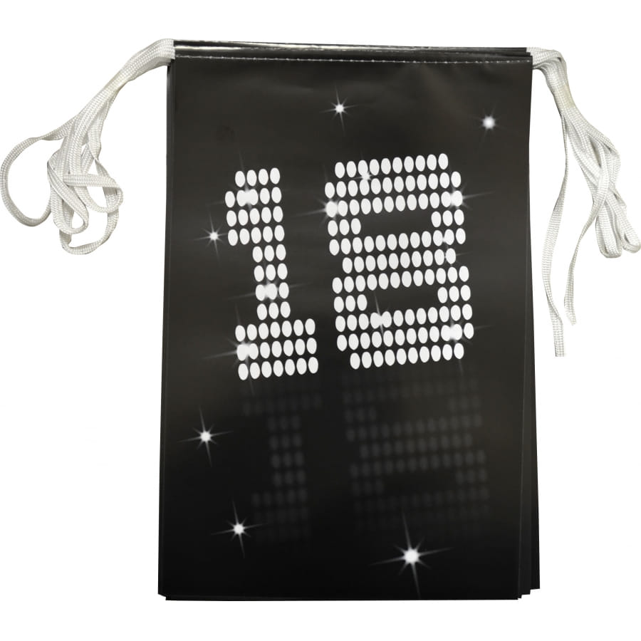 Pour un anniversaire de 18ans, pourquoi ne pas le faire sur le thème bling bling. Cette guirlande apporte une touche de glamour. De couleur noir cette guirlande fait 4 mètres de long avec 8 pavillons en papiers de 20 *30 cm. Sur le recto comme sur le verso ces écrit 18ans en blanc. Elle est aussi disponible pour les 20ans, 30ans,40ans et 50ans.