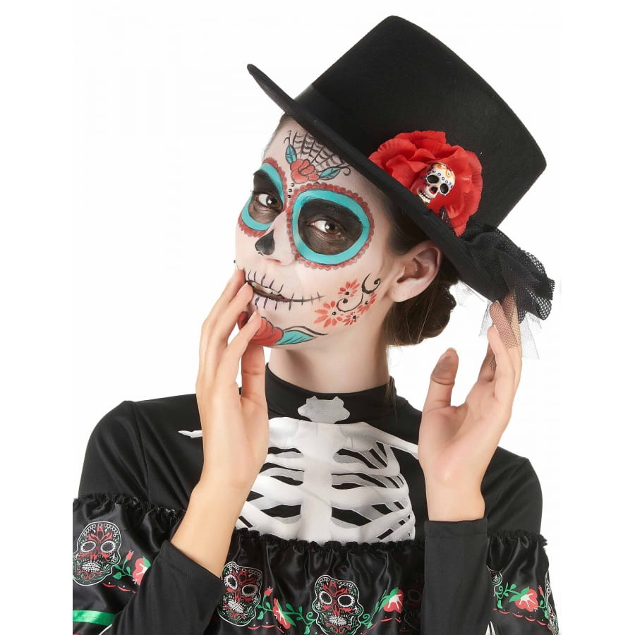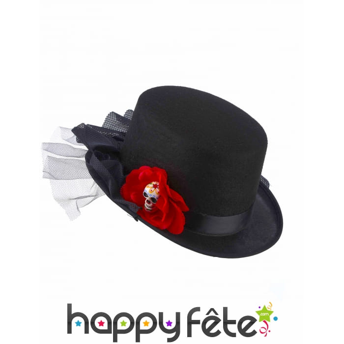 Ajoutez du mystère et de la frayeur à votre costume de vampire en arborant notre haut de forme avec fleur rouge et crâne.